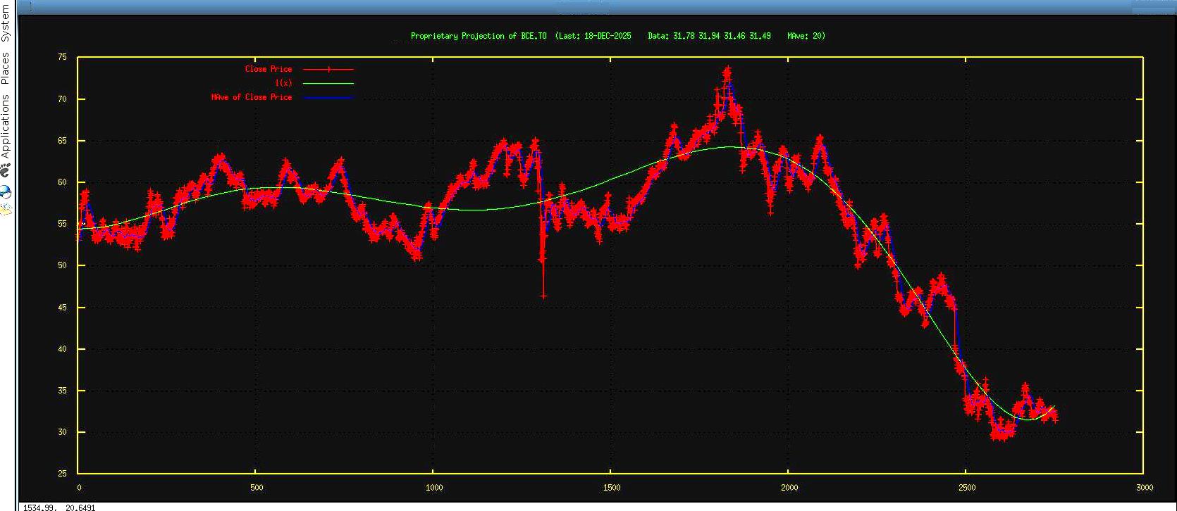 This is 10-year (Jan. 2, 2015 to Dec-18-2025, daily Open,High,Low,Close chart, and AI-mechanical forecast for BCE, the big Canadian telecom, that is recovering from absurd and terrible CRTC decisions, which a wiser government might at some point seek to correct. The share price has been hammered, but the dividend is 1.75/shr, earnings are positive, and cash-flows significant. This isn't financial advice, but it would seem that a share price of around $40 Cdn, would make more sense than a 31 to 32 ($Cdn) price. Why? The current price looks cheap. You can buy most of the entire Canadian telecom system, (which has a *lot* of fast fibre now), for less than $22 billion US, which is less than what one single data-centre in USA costs. Everybody hates telecom now, but we noticed that Starlink is getting a bit slow at times. Plus I see their little satellites falling from the sky, every so often. In a low-interest rate environment, leveraged telecoms with big cash-flows, and fast interconnection technology, seem to be awfully cheap. If anything happens to the satellites, the telecoms - with both fibre, copper, and local wireless - will go back to owning all the digital world. FD: We bought a little bit of BCE, so yah, I am talking my position, but I am also putting my money where my mouth is. :) (Click to enlarge image, ESC to exit image enlargement.)