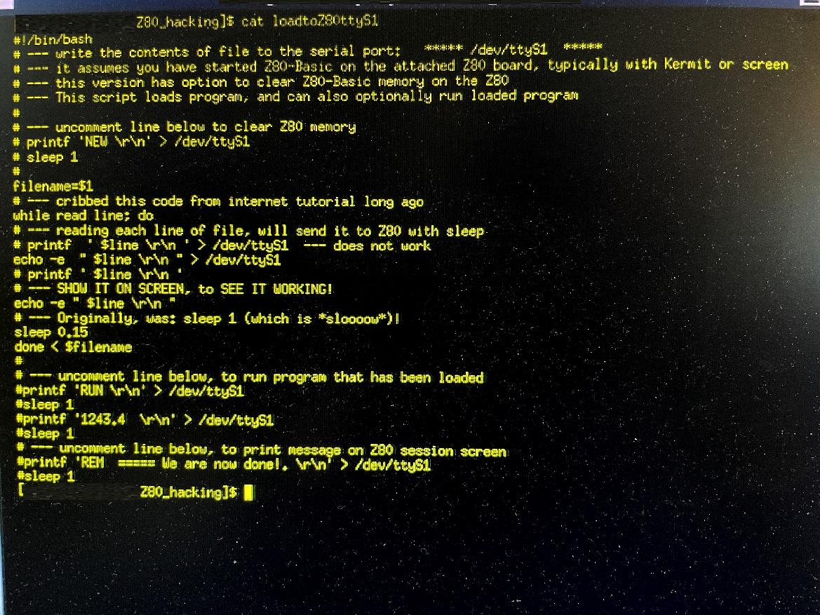 This little program is a BASH shell script that takes any filename, and loads it line by line, to the Z80 (or any serial device attached to the Linux P/C serial port, and has a slight pause, sufficient to allow the Z80-Basic to save and register each line of the program. This little script works really well, and with it, and the Kermit "log session FILENAME.BAS" feature of Kermit (which lets you just capture the contents of a Kermit session, and write it to a file), one can load program to the Z80, and save them from the Z80, into Linux files on any Linux machine.