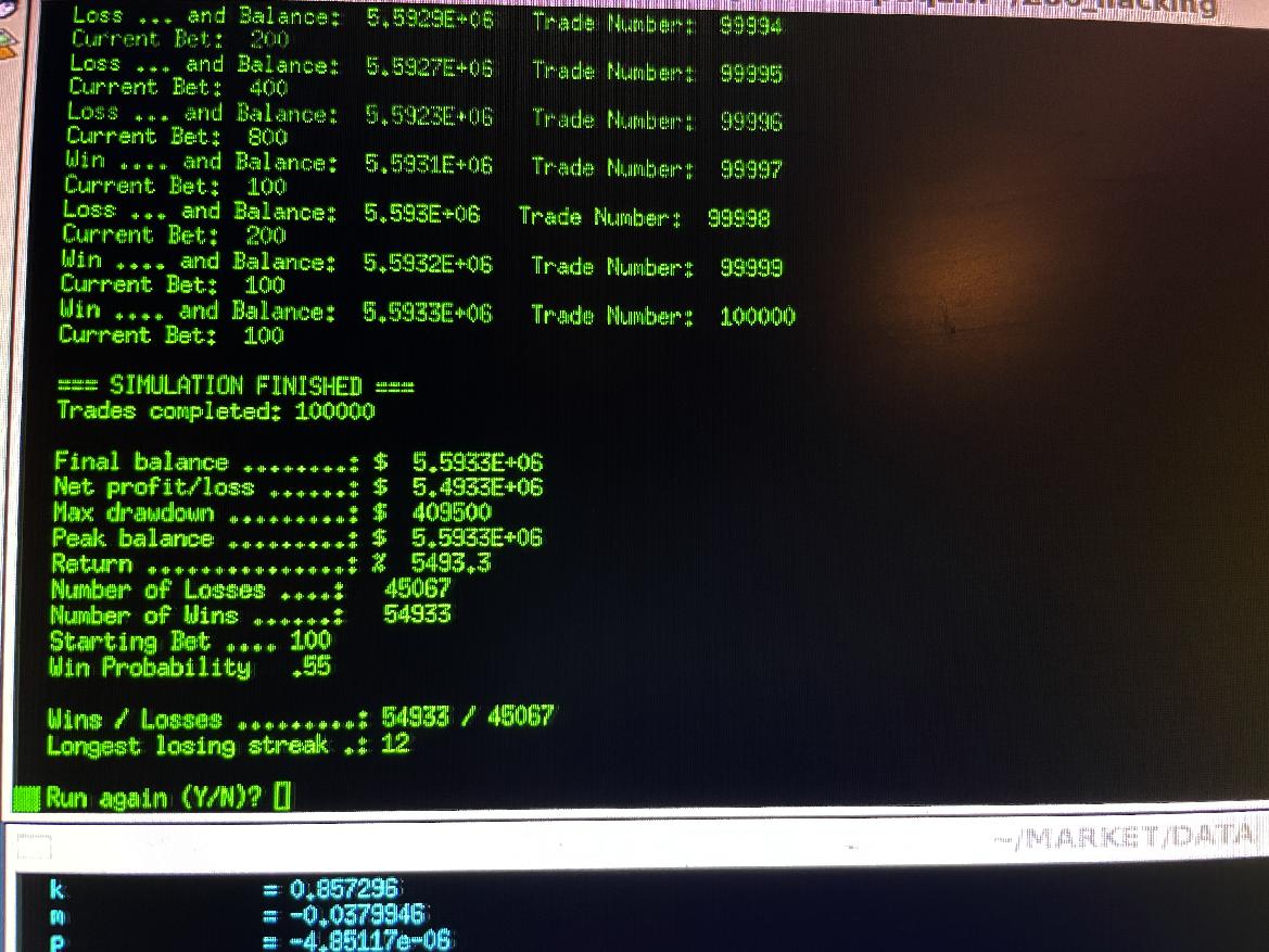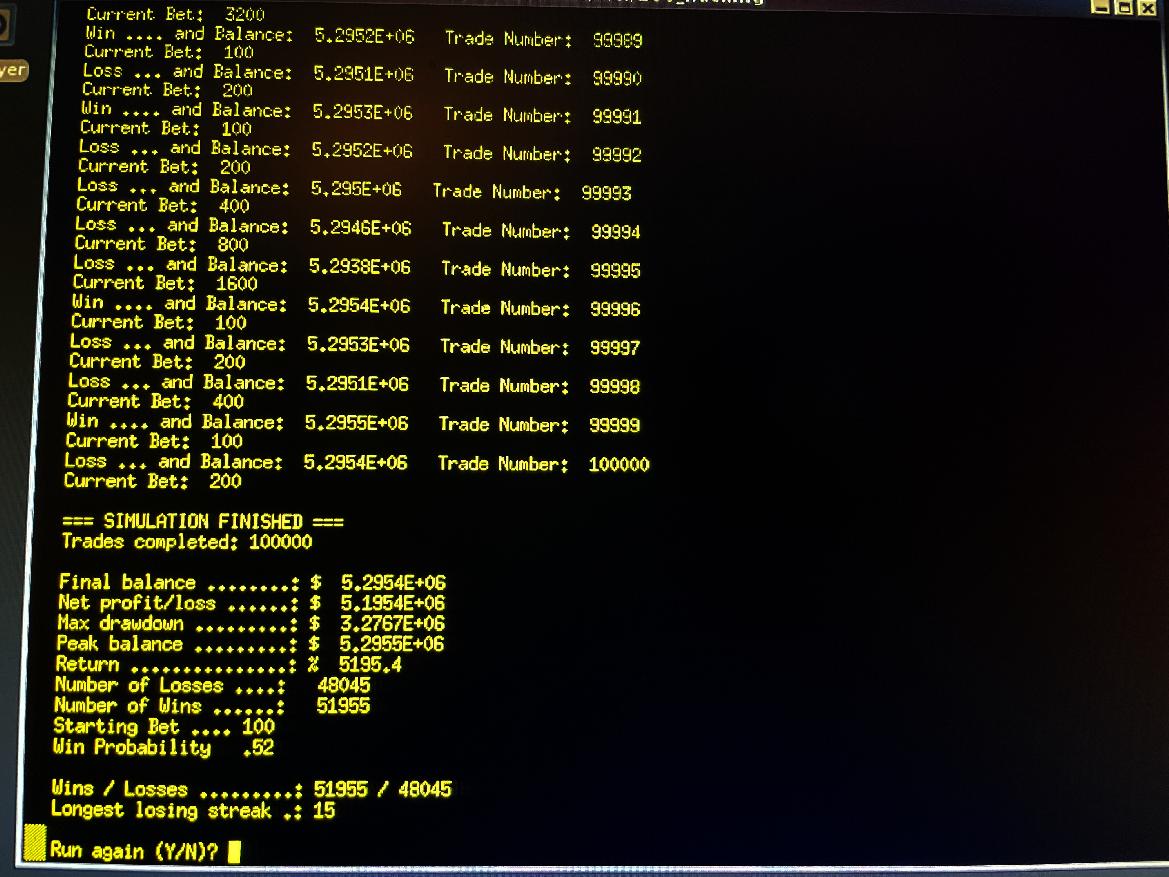 Here is screen-shot of final run result of Martingale Simulator making over 5 million dollars, starting with 100,000 dollars, and an initial bet-size of $100, and a win probability of 0.52 (a very small edge), and 100,000 trades.