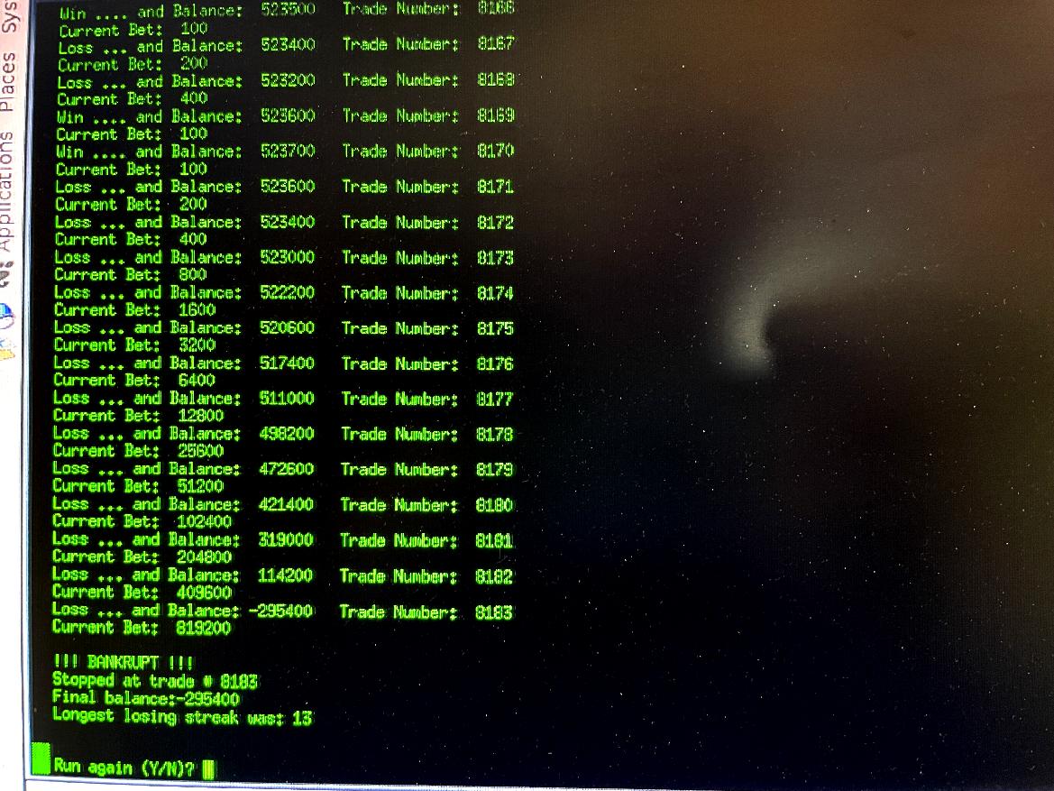 [ Martingale Trading Simulation Program, Run of 100,000 trades - Jan. 13, 2026 ]