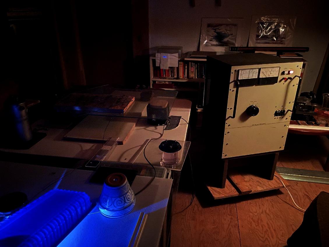 The N2 TEA Laser is interesting - especially the smaller one I just built. The beamspot, on a plain white envelope, is blue-violet, even though the beam is invisible, because it is in the ultraviolet (337.1 nm), but it will typically make white paper glow. The iPhone camera seems to be quite sensitive to ultraviolet, and so it shows a bright image in this closeup. The beam displays an interesting dispersion, which looks to be an artifact of the laser's super-radiant operational feature. The beamspot appears to almost be an optical Gaussian distribution. I find these N2 TEA (Transversely Excited Atmospheric) lasers quite interesting, since air itself is the medium that is being stimulated by the high-voltage electromagnetic pulse from the laser rails, to create the laser pulse. (Click on image to expand, ESC or click outside image to exit)