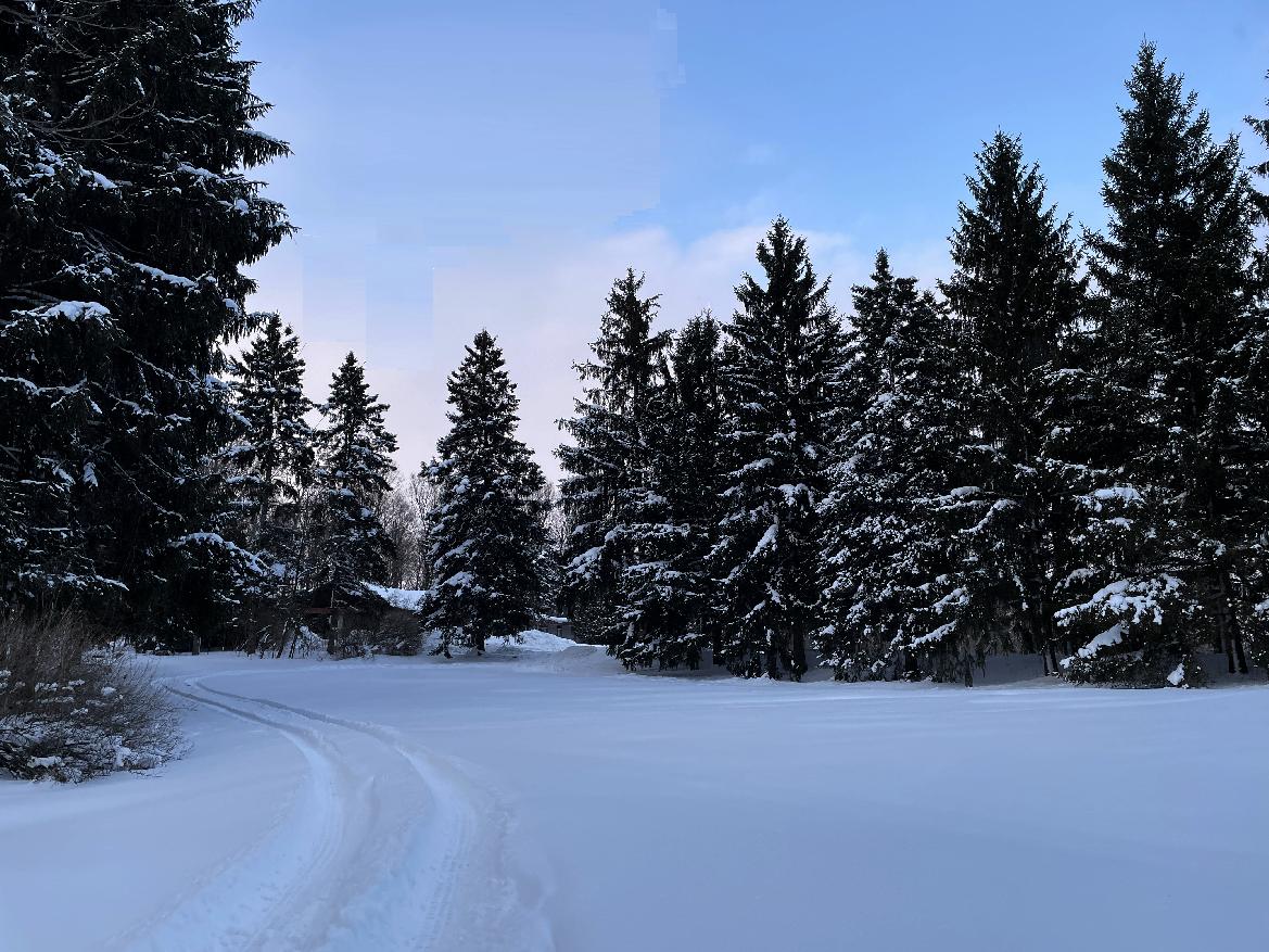 Here are tractor tracks in the snowfield, with Evergreen's and Blue Sky. The greatest and most valuable thing is land that yields both harvests and beauty. (Click to enlarge image, ESC to exit image enlargement.)