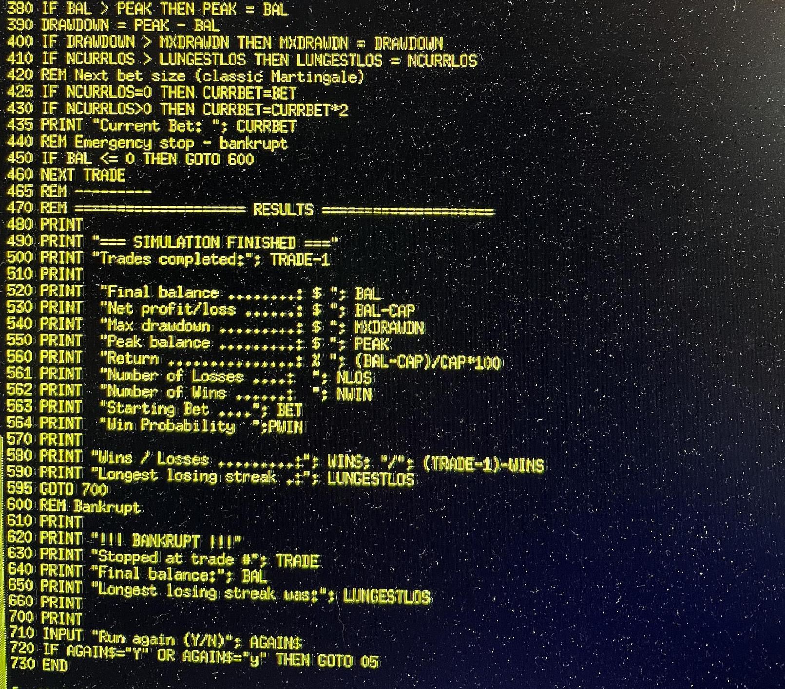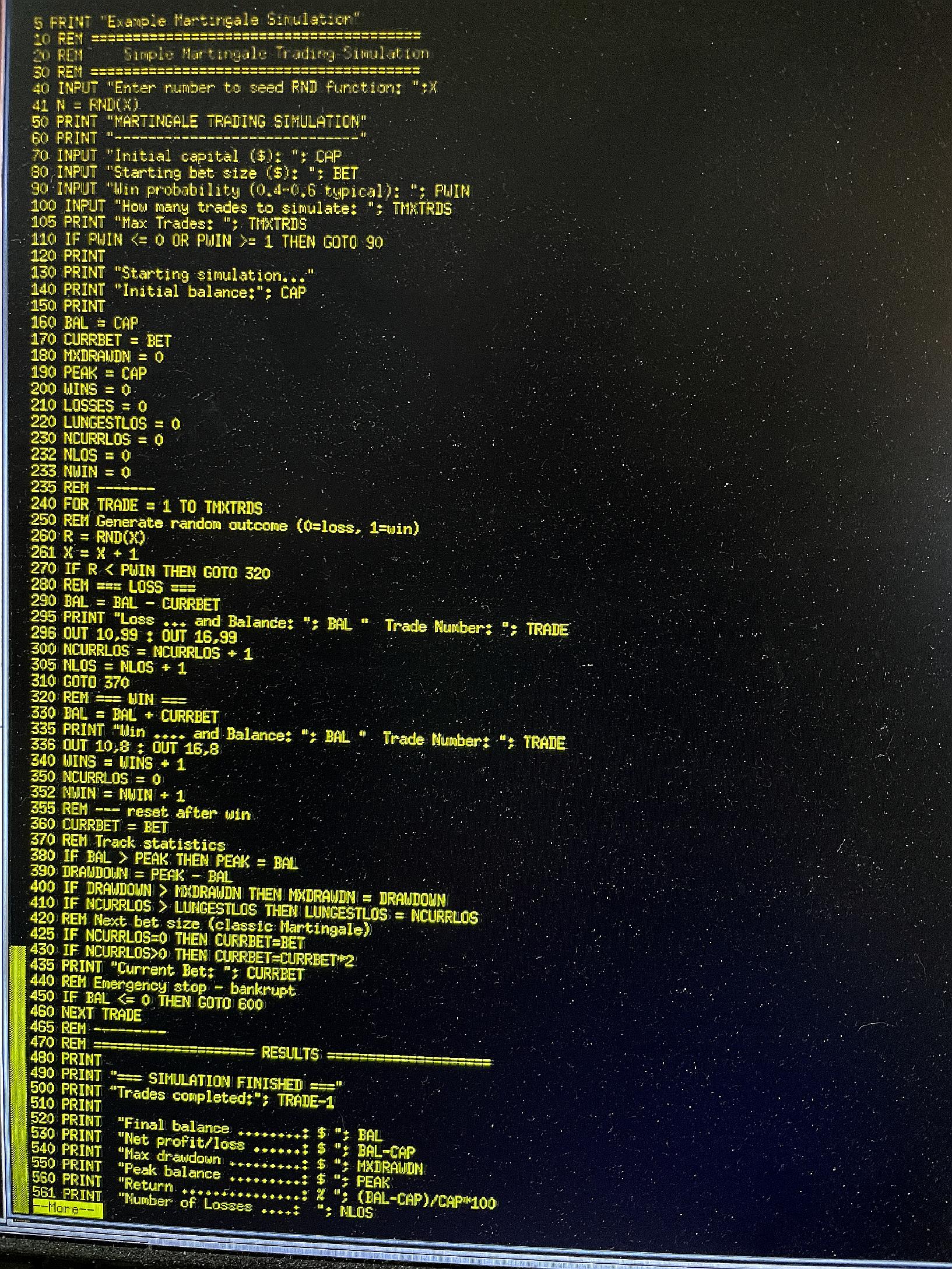 I asked the Grok.com AI to write a Martingale Trading Simulation program, in BASIC, so I could