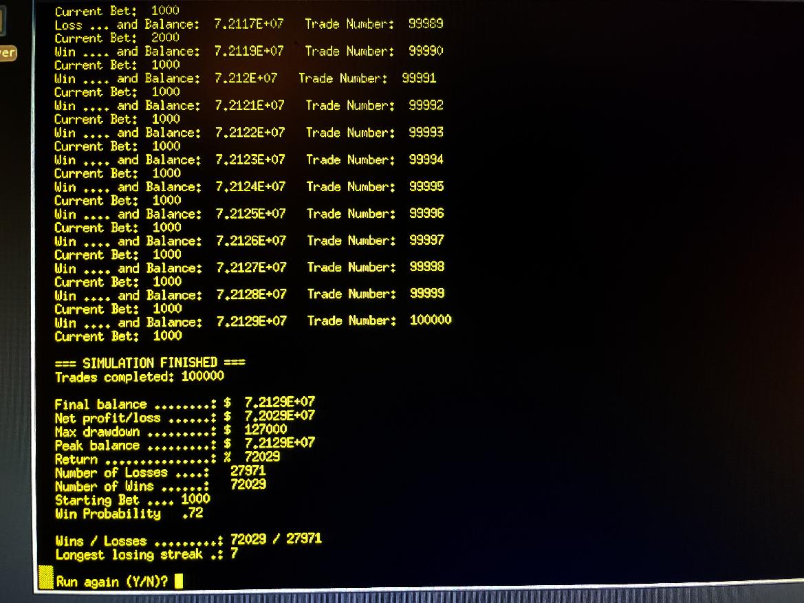 Here is screen-shot of final run result of Martingale Simulator making over 72 million dollars (!), starting with 100,000 dollars, and an initial bet-size of $1000, and a win probability of 0.72 (a very *BIG* edge), and 100,000 trades.