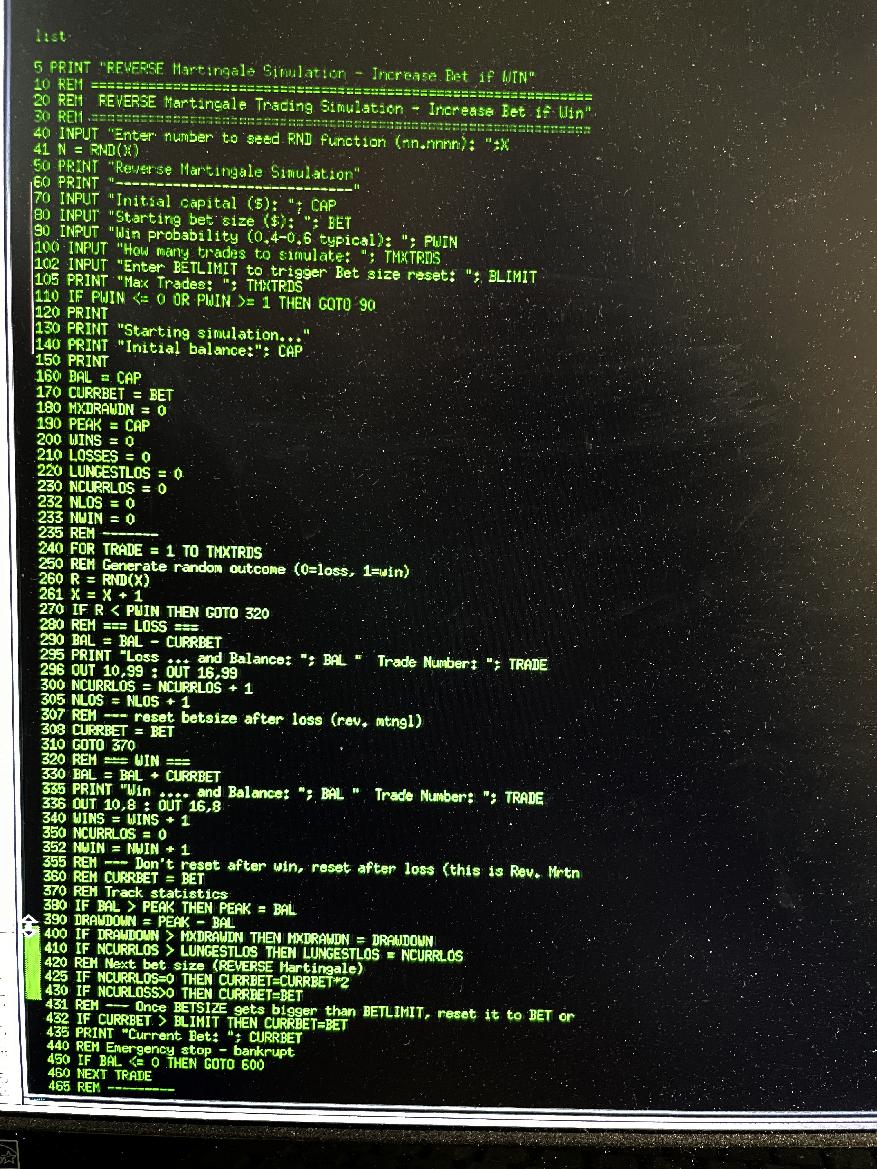 The screen-shots are all from my Z80 stuff - but now, as of Feb. 7, 2026, at the page bottom, I have modern X11Basic code, for MARTGLX11.BAS (the Martingale Simulator), and REVMTGLX.BAS (the Reverse-Martingale Simulator), in plain-text. If you install the X11Basic interpreter on a Linux machine, and just copy/paste this program code into a couple of different files, you can load, run and play with these programs, and enter different initial amounts of capital, bet-size, win-probability (the trader's "edge"), and the number of trades to simulate - 1000, 10000, 100000 or whatever. The evolution of the trading (betting) action is very interesting to observe.