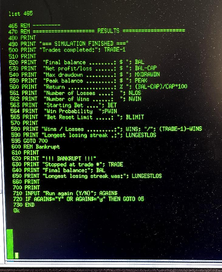 I built this code, by first asking GROK AI to write a Martingale Simulator in Basic, so I could run it on my Z80, just as an experiment. It's proved so fascinating, that I found a good BASIC interpreter, called X11Basic, and built and installed it from source, on several Linux machines. The Martingale and Reverse-Martingale simulators were brought to my attention, by the blow-up of "Captain Condor" (David Chau), who on Christmas Eve, in 2025, he himself, and along with his followers, were using the "Iron Condor" options strategy, to make leveraged options bets on the SPX, when realized volatility and implied volatility were not in alignment. If their trade lost, they would triple (!) bet size, and do the trade again. I recalled the "Martingale" betting system, where a gambler doubles-down after each loss, is generally regarded as a strategy which eventually destroys gamblers. And this was the case, where the scaled-up "Iron Condor" trade lost roughly $50 million, wiping out a large number of traders who were following "Captain Condor", using this strategy.