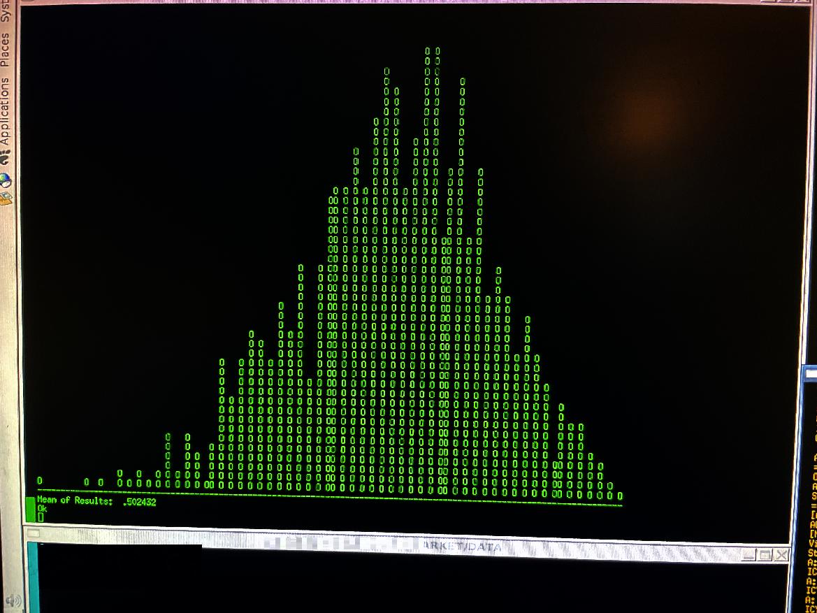 This nice histogram shows all is pretty good. I had the program generate 1000 boxes of 5 rows by 80 columns, and "randomly" wrote either a dot or a space in each cell. Then, for each box, I range-scaled the result onto a 130 column by 80 row histogram display. One should get a nice bell-curve (a "Gaussian" curve), with a mean value around 0.50. And this is pretty much what we get, so it means I can trust the quality of the pseudo-random numbers, as being close enough to random, for any simulator which needs random outcomes, to work correctly.